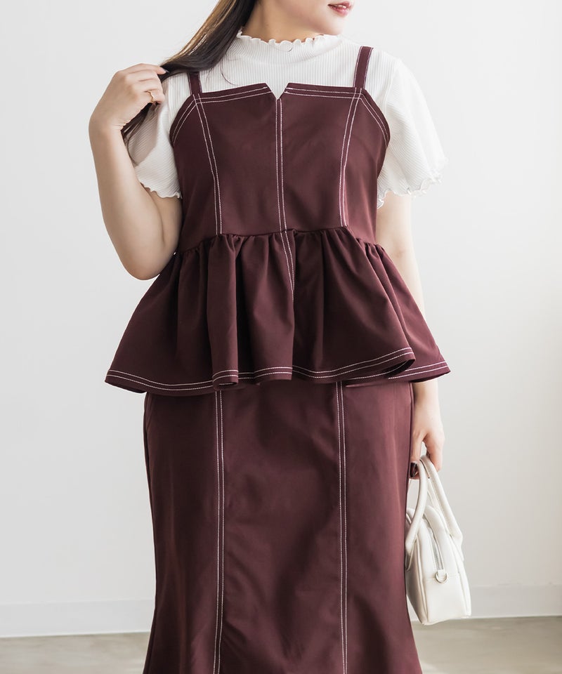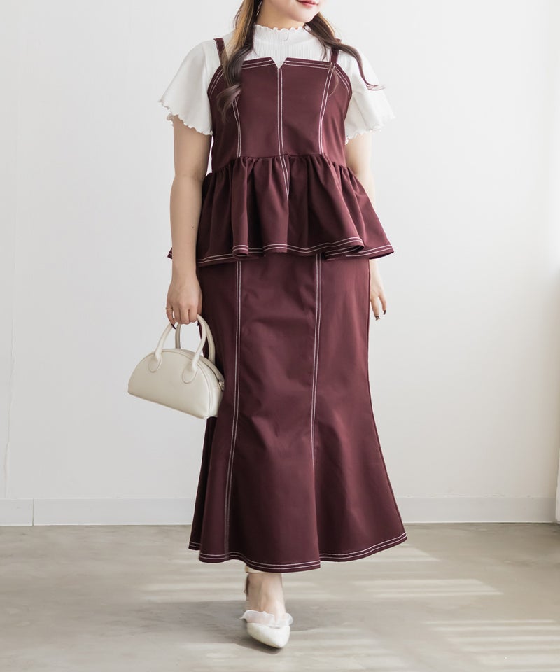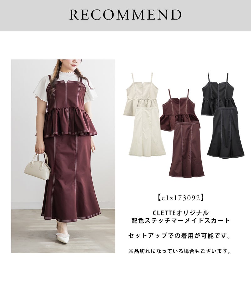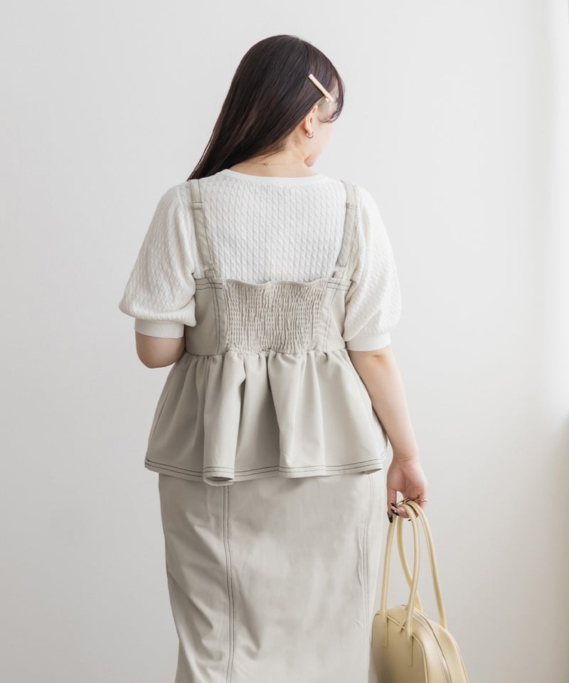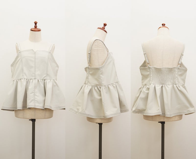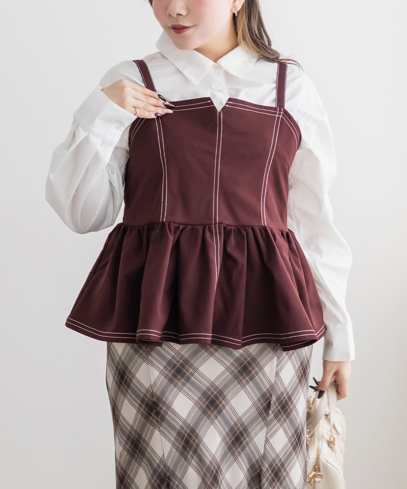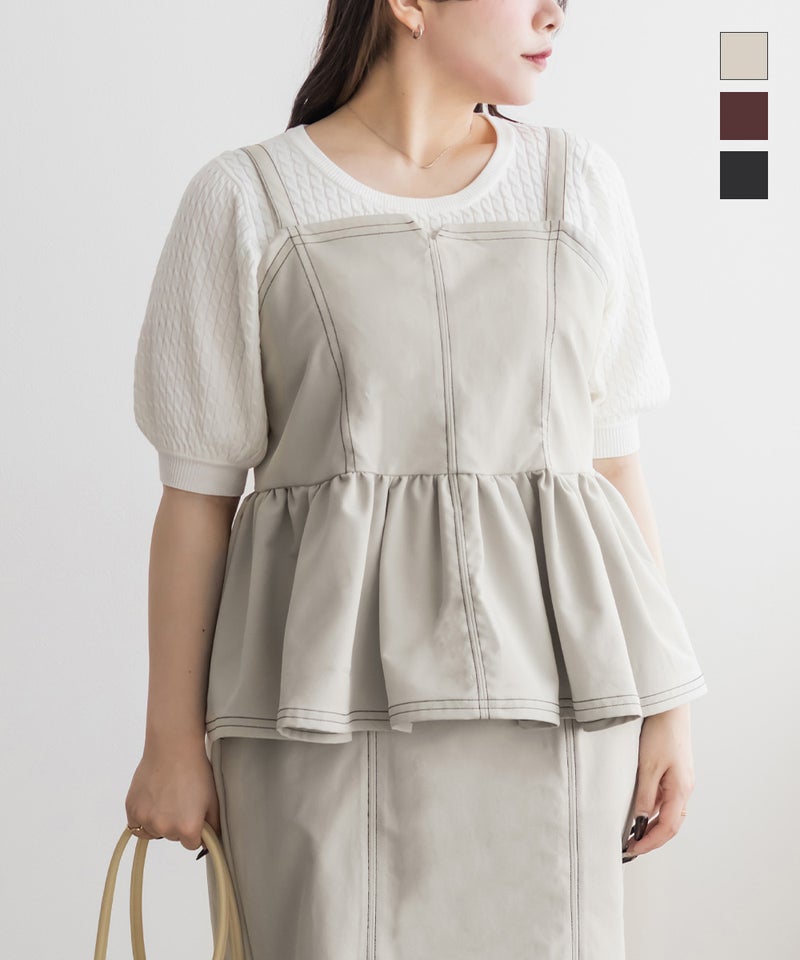【design】配色ステッチがポイントのペプラムビスチェ。立体感のあるフレアシルエットで、可愛らしい印象。【material】しっかりとしたハリ感のある素材です。【styling】デニムパンツや柄・同色のスカートとも相性抜群。マーメイドスカートとのセットアップで着ると、統一感が生まれ上品な印象にも仕上がります。