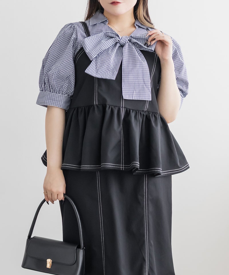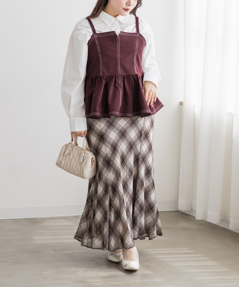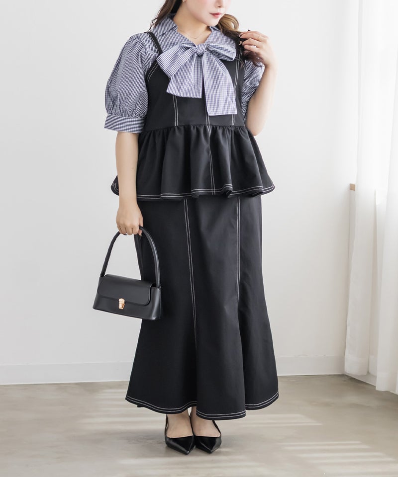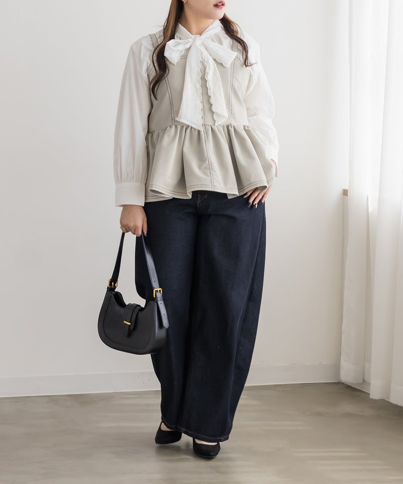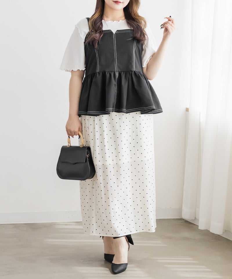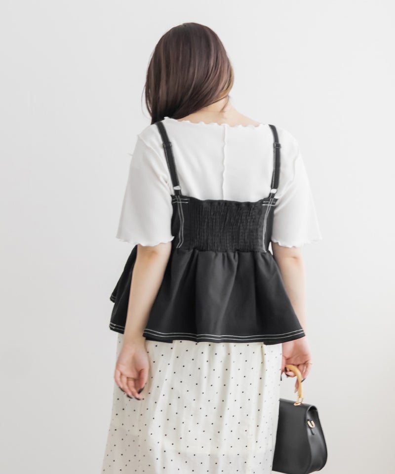 【design】配色ステッチがポイントのペプラムビスチェ。立体感のあるフレアシルエットで、可愛らしい印象。【material】しっかりとしたハリ感のある素材です。【styling】デニムパンツや柄・同色のスカートとも相性抜群。マーメイドスカートとのセットアップで着ると、統一感が生まれ上品な印象にも仕上がります。