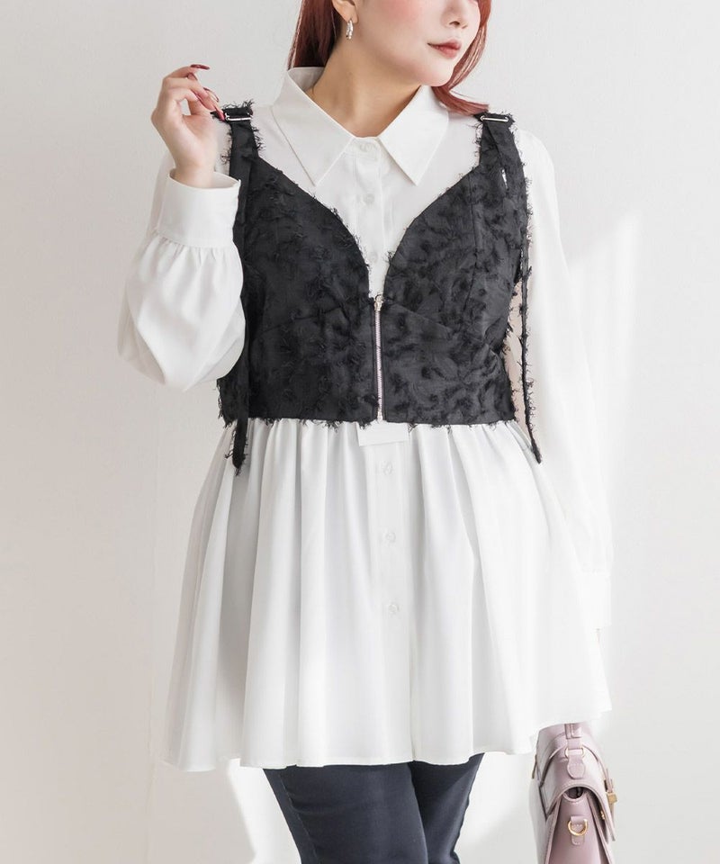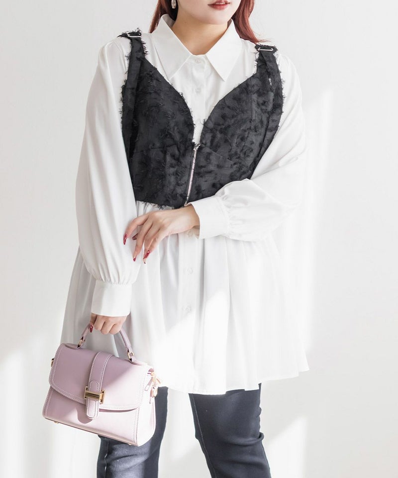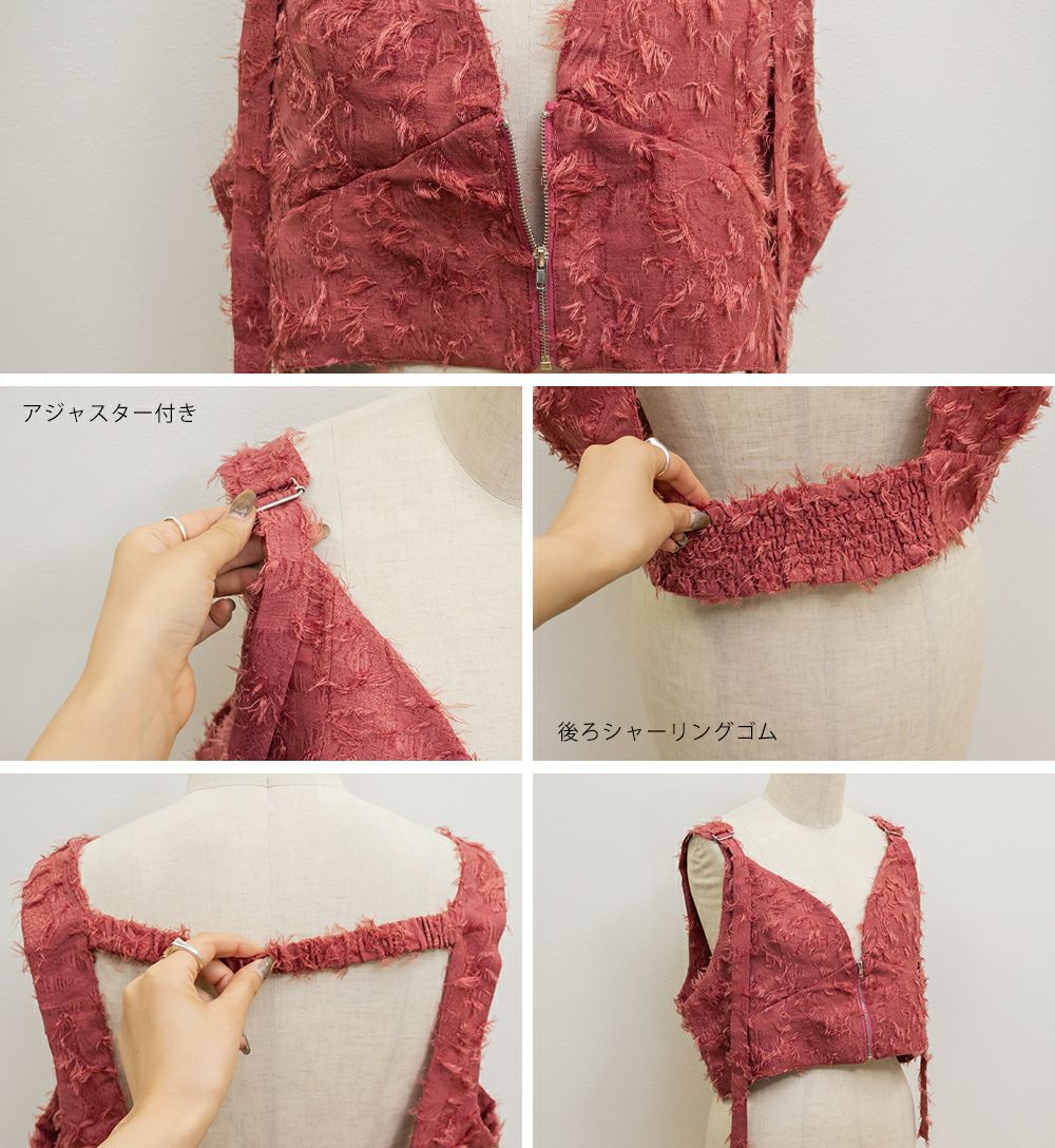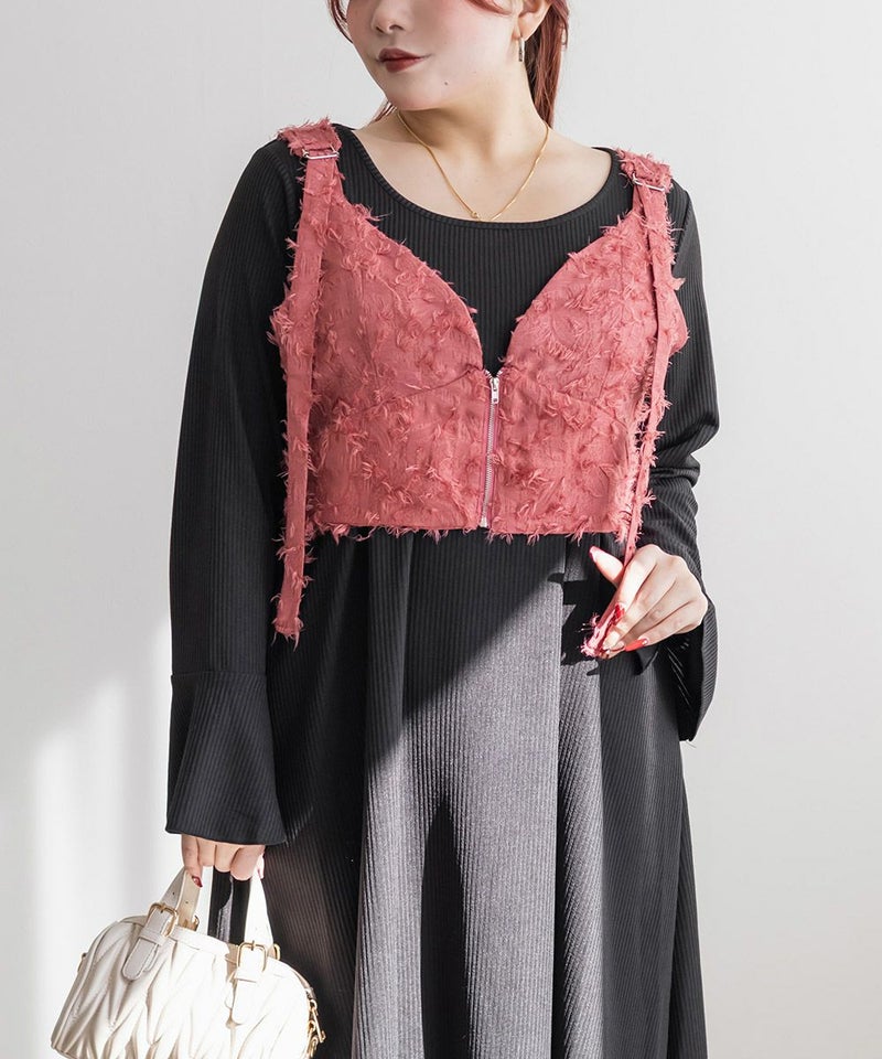 3Lを着てピッタリのサイズ感でした。後ろはゴム入りで、窮屈感のない着心地です。立体感のあるフリンジジャガード素材が印象的な、大人っぽい主役級ビスチェです♪存在感がありながらも上品で、いつものコーデにプラスするだけでぐっとおしゃれ見えします!程よい厚みとハリのある生地感が、ボディラインを拾いすぎずきれいなシルエットをキープしてくれるのも嬉しいです◎Tシャツやシアートップス、シャツなどとのレイヤードにぴったりで、季節を問わず活躍するアイテムです。