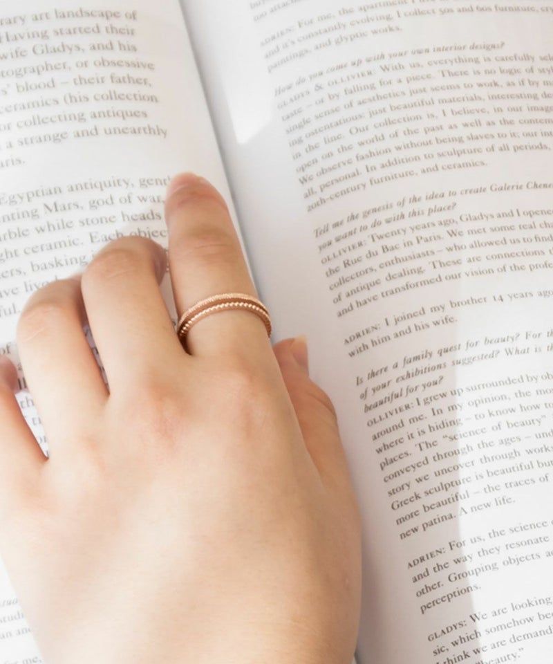 付ける角度によって雰囲気の変わる万能リングです◎肌なじみの良いピンクゴールドが手元を明るくキレイに見せてくれそう。コーディネートを選ばずにたくさん使い回せそうです!