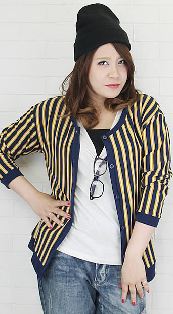 着やせ効果のあるストライプのカーディガンをボーイフレンドデニムに合わせれば、