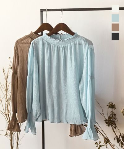 女性らしいデザインで1枚で来ても着映えして良かったです。 肩周りが切替えが外側にあるからか結構大きくて、肩幅が余計に大きく見える気がしますが二の腕の絞り?のおかげでそこまで膨らまずに着れてるかなと思いました。 生地は思ったより少しゴワゴワした肌触りでした。自分は少し敏感なので手首のとこがやや痒くなりますが、ゴムがあると楽に袖がまくれるし、すっきり見える気がするので個人的には好きです。 カラーはブラックにしましたが、透け感もちょうど良くて品よく見えました。