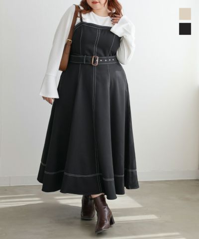 身長150cm/体重70kg/バストGカップ 丈感はやはり長め 厚底もしくはヒールが高めの靴を履かないと地面ギリギリ 階段とかしゃがんだ時に裾を気をつけないと踏むし、転ぶかもしれないから注意 肩にあるアジャスターでそこはかとなく調節はできるけど、上げすぎると腰のベルト位置が不自然になるためこれも注意が必要かな 生地感は薄目でサラサラしてる 裾がふんわりするから可愛い 夏は丁度いいけど、冬に着るなら厚めのタイツが必須 トップスを変えるだけで色々雰囲気を変えることが出来ると思う 欠点としては、縫製が甘いところがある 外に糸の端が出てる所が何ヶ所かあったから、自分で内側になるように処理しました でも、可愛いから全部許す