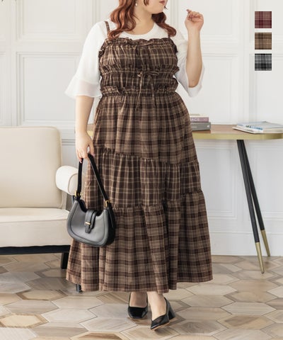LLサイズ欠けていて3Lにしましたが大きすぎず着られました。 色はなんとも可愛いワインレッドみたいな色がベースのチェックです。 丈かなり長めです。肩紐で長さ調節できますが長いです。