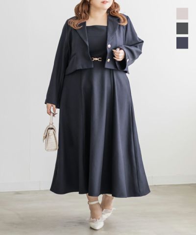 ピンクの3L購入しました。 お色味はピンクというより結構白よりです。 ワンピースはぴったりめ、ジャケットはデザイン的にもだいぶゆとりがあります。 私の場合ですが、ボタン開けると黒ベルトが見え締まって良い感じですが、閉めて着るとちょっと微妙な感じになってしまいました。