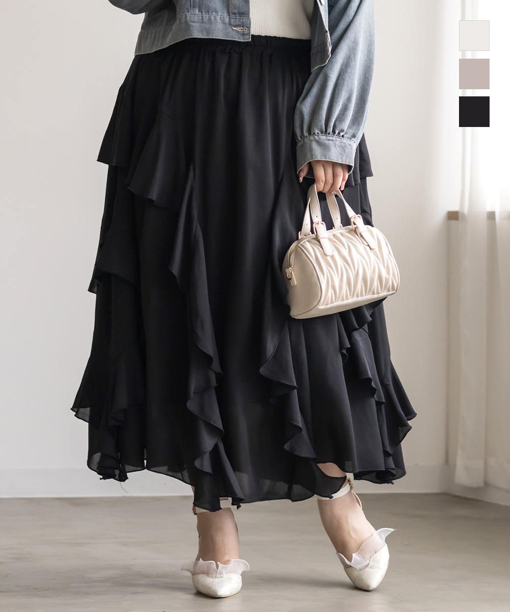 165cm86kg 108/86/108 3L購入しました! サイズ表で見るとウエストは82~になってますが、生地の量で少しずり落ち気味になるので、若干小さめがジャストだと思います!ちなみに私はちょっとずり落ちます! 重くない生地をふんだんに使ってて、動く度ひらひらひらひら綺麗に見えてとってもお気に入りです。 黒を買ったんですが、白も買おうかな〜と悩んでます。かなりおすすめです!
