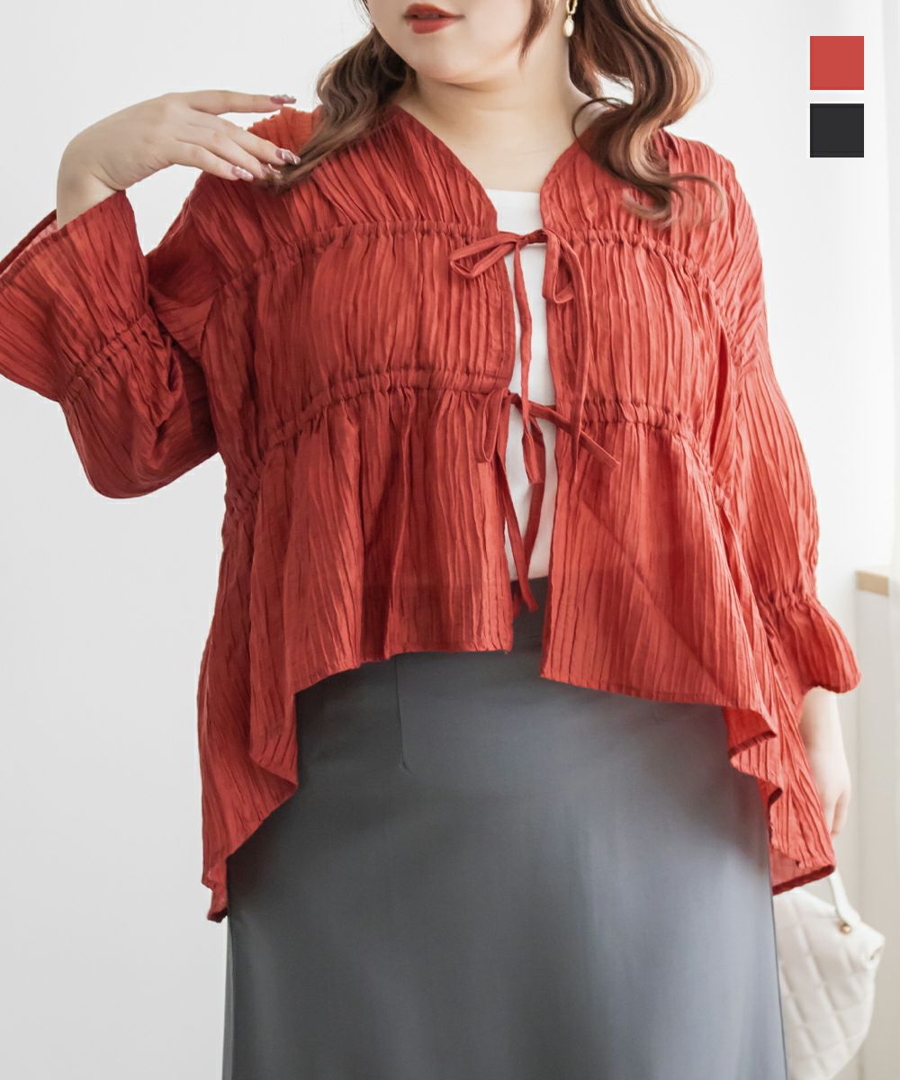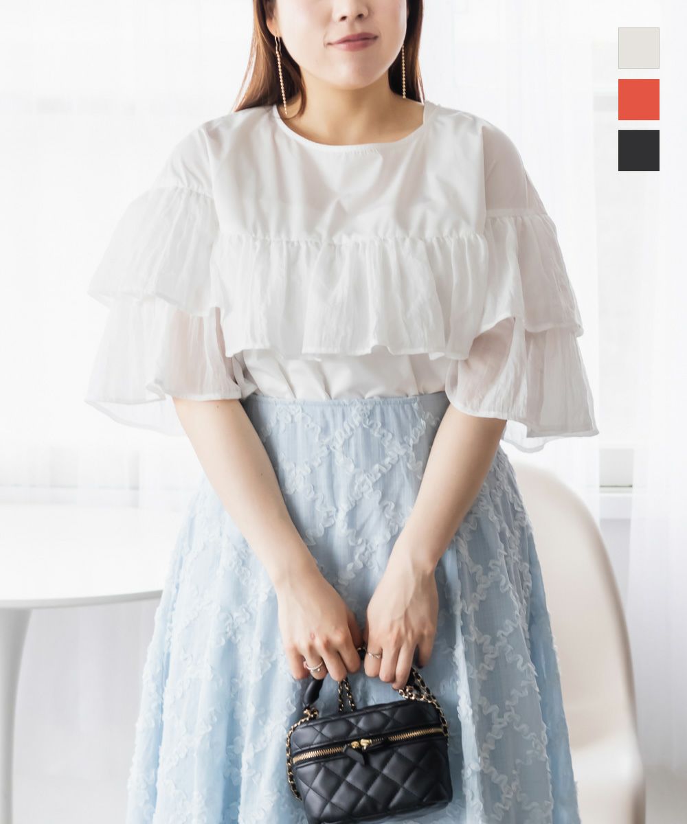 オレンジ3L購入しました! パキッとした色合いが珍しく悩んでたら完売しており、再入荷されたので即購入!!! 生地は2種類でフリルとその他、通気性が気になりました!汗ジミが目立ちそうです! フリルのボリュームがあるので、前インしたほうがスッキリ見えます! 淡い色合いが多いですが、ハッキリした色味ももう少し多かったら嬉しいです^^ -