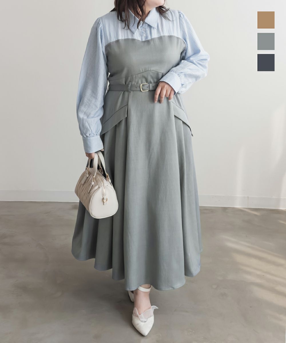 普段ワンピースL〜3L着用でLL購入いたしました。 サイズ感ぴったりで、ベルトもあるのでウェスト部分がきゅっとなりシルエット凄く良かったです! ただバスト部分いつもより窮屈に感じたので、バスト大きい方は要注意かもです。 シャツが思っていたより青みが強く、グレーのシャツ色だったらより好みだったなぁと思います。 でも可愛いので凄くおすすめです!