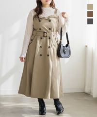トレンチデザインが大好きなので見逃せませんでした。同時期発売のトレンチ風スカートにしようかとても悩みましたが、ウエスト寸法が心配だったのとスカートの方が裾幅が広いのではと予想しワンピースに決定。ワンピースの方が、ボタンの位置が上寄りで目線もやや上寄りになってよりスラリと見えるような気がします。3色どれも良いなと迷い、ブラックは重たく見えるかもとかベージュは汚れると悲しくシワがどうだろうとか考えた末にブラウンを購入。4Lサイズです。 トレンチコートを少し薄くしたようなハリのある生地です。背中のゴムでウエスト周りが伸びるためスポッと着られます。ただ私の場合胸元がぴったりしているなと感じます。サイズ表に身幅は表記がありますがバストとしての表記は無いので、胸が大きめな方は重ね着の際気になるかもしれません。 肩紐がしっかり太めで安定します。丈は159cmの私でふくらはぎが隠れて丁度良いです。デザインポケットとベルトと胸元の折り返しがアクセントになりかわいいです!夏以外は着られるので色々なトップスや靴との組み合わせを楽しみます。 -